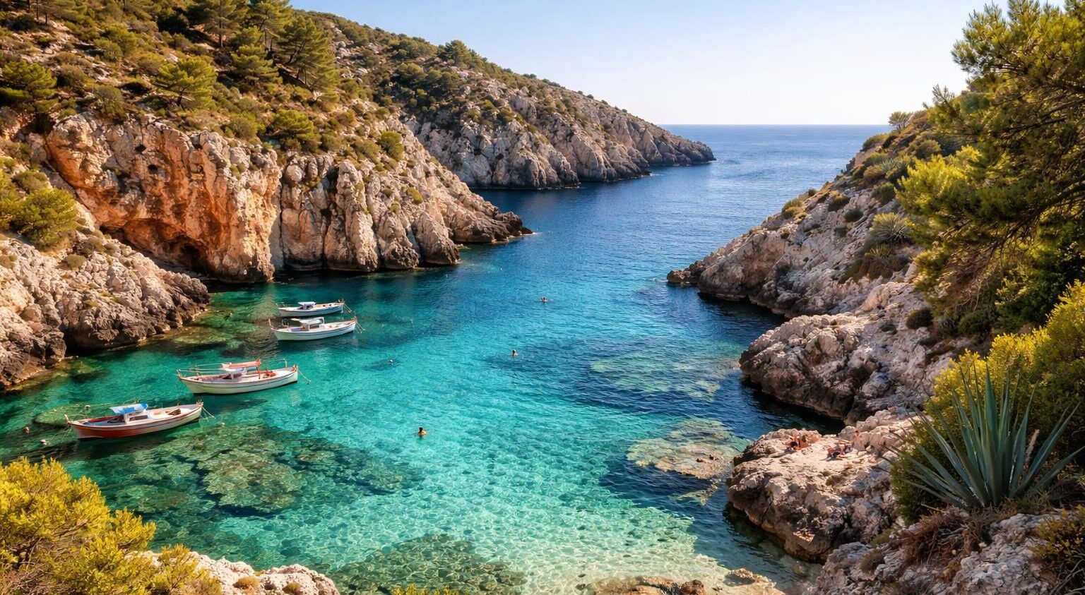 Le parking est gratuit et situé au sommet de la colline, d’où partent les sentiers menant à la plage. Sachez que la crique ne possède pas de véritable plage sableuse, mais un petit coin caillouteux offre un espace pour poser une serviette et profiter de l’eau claire. Un petit rappel utile : oublier le bronzage classique sur serviette et privilégier les baignades.